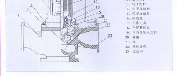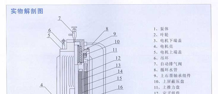 14、獨(dú)特的便排拆式結(jié)構(gòu)使泵在正常使用維護(hù)中,如除水垢、檢查石墨軸承的麿損度時(shí),只需拆開電機(jī)殼與電機(jī)下端蓋上的連接螺絲,在電機(jī)殼的頂出螺絲孔內(nèi),頂出電機(jī)與定子組件部分,因此維護(hù)與定期檢查極為方便。